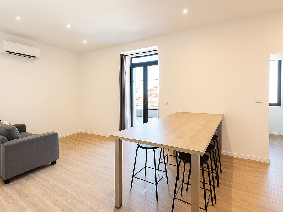 Appartement au 1er étage sur 2, cet appartement T3 de 55 m2. Il est composé d'un séjour/cuisine ouverte donnant sur une terrasse privative de 36 m2.