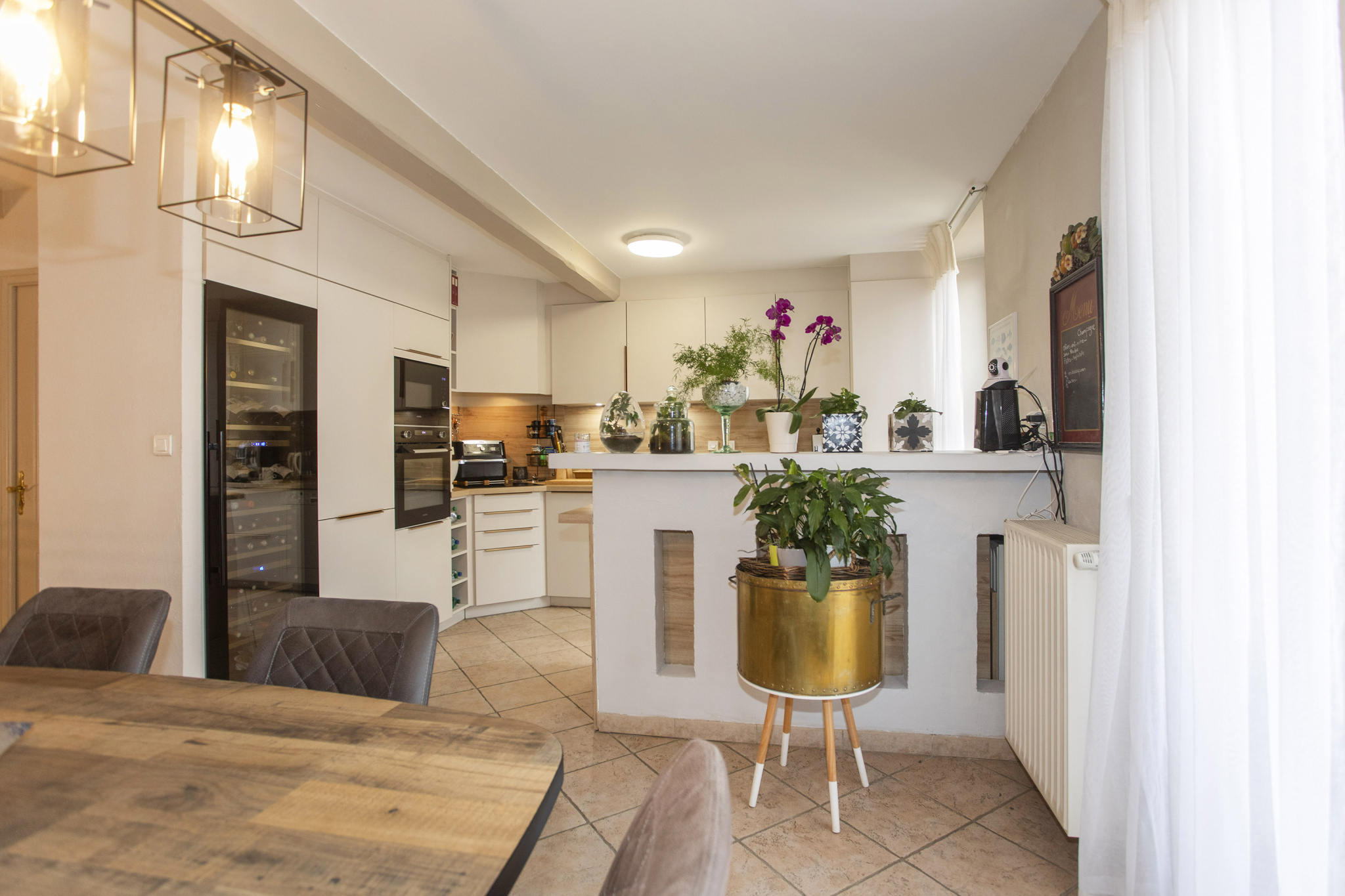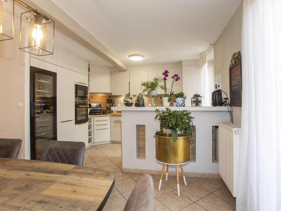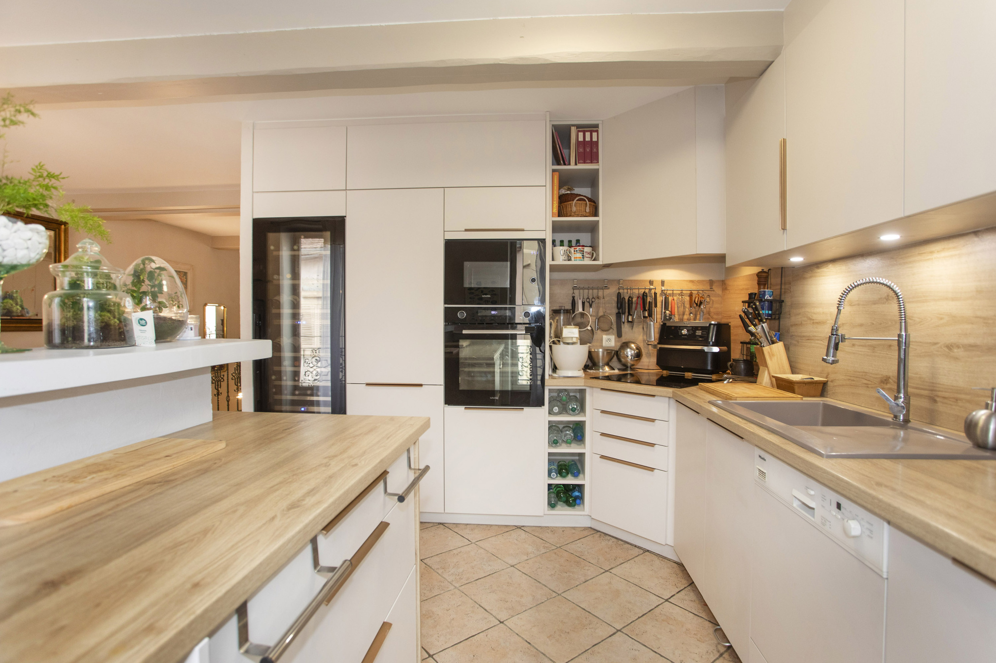 Entièrement réaménagée et équipée récemment, la cuisine moderne dispose d'un îlot convivial, d'équipements haut de gamme et d'un cellier/buanderie pratique.