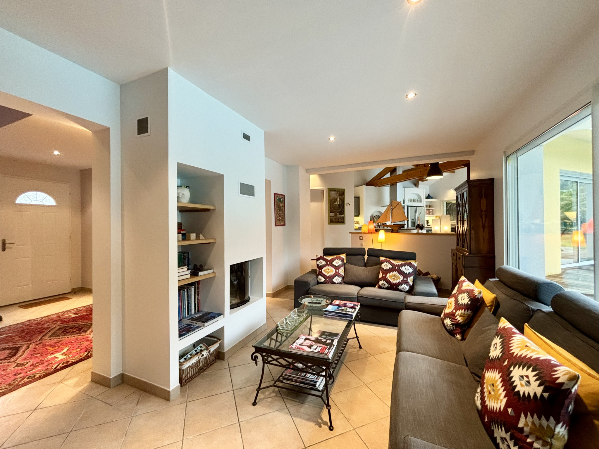 Découvrez cette magnifique villa d'architecte de 200 m2 (dont un appartement indépendant de 40 m2) nichée sur un terrain arboré en lisière de forêt, elle offre un calme absolu et aucun vis-à-vis. La villa dispose d'un très grand espace cuisine, salle à manger bénéficiant d'une grande hauteur sous plafond avec poutres apparentes pour une touche d'authenticité, d'un séjour cosy avec cheminée, et d'une vaste entrée séparant l'espace nuit et sa très belle suite parentale. L'ensemble donnant sur un magnifique espace extérieur avec piscine de 8m x 4m chauffée, celui-ci bénéficiant d'un ensoleillement exceptionnel. À l'étage, deux chambres et une salle d'eau complètent l'espace. Un appartement avec accès privé de 3 pièces avec sa propre terrasse ajoute une touche d'exclusivité. A l'écart de la maison, se trouve sur le terrain un chalet de 20 m2.