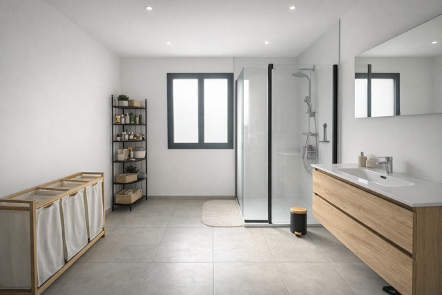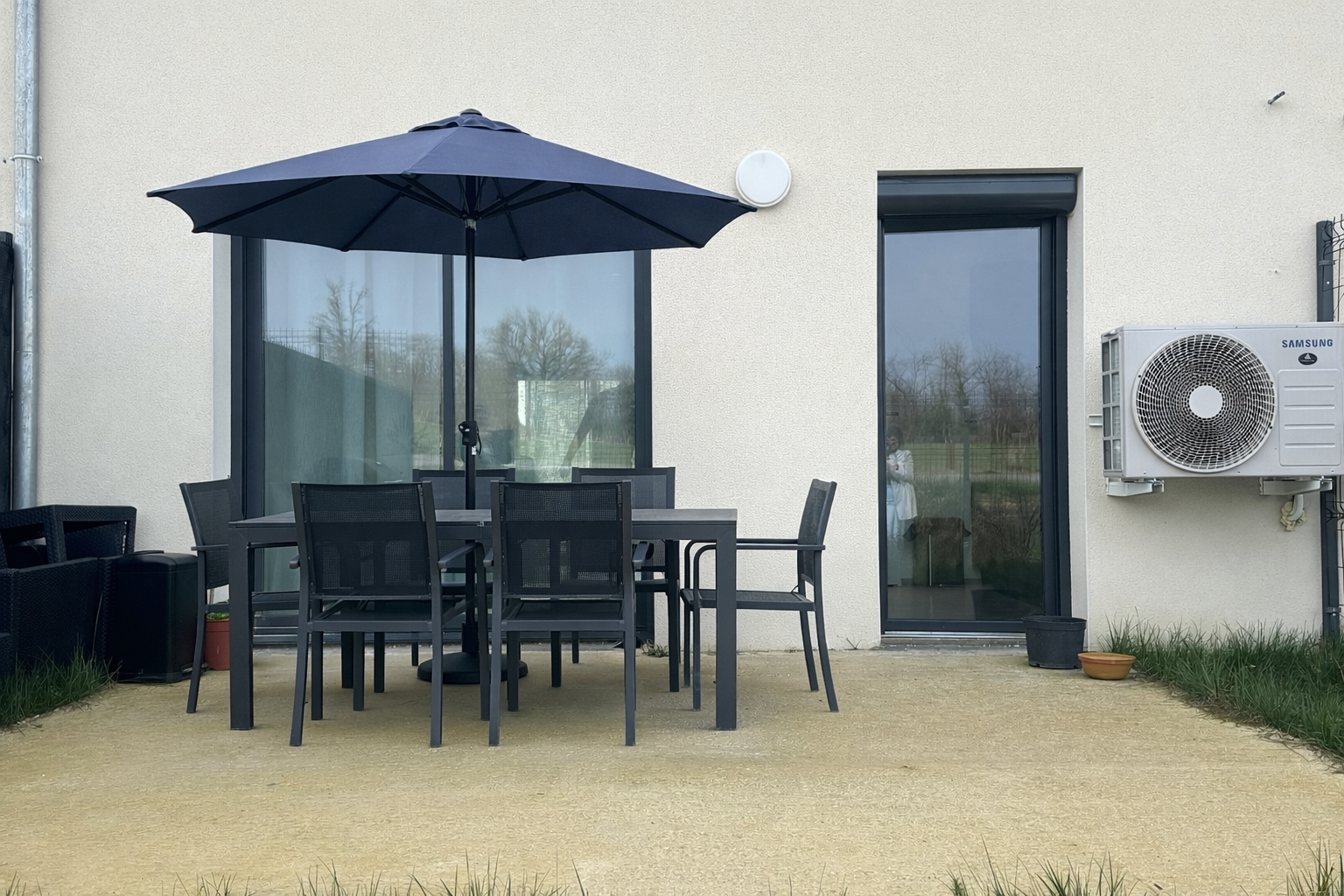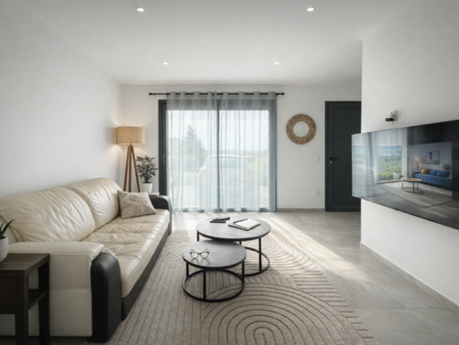 Une grande pièce de vie lumineuse de + de 30 M2 avec cuisine équipée, un cellier, un wc le tout donnant sur une terrasse et jardin.
