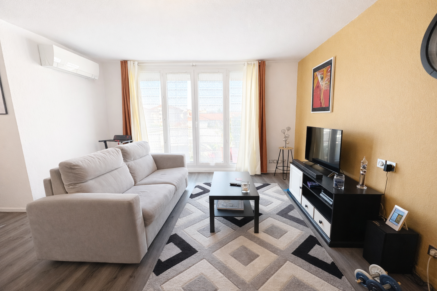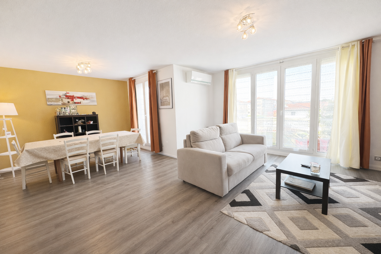 un séjour / salon lumineux de 35 m2 avec climatisation réversible Accès à deux balcons Cuisine indépendante équipée Chambre avec mezzanine Buanderie WC indépendant