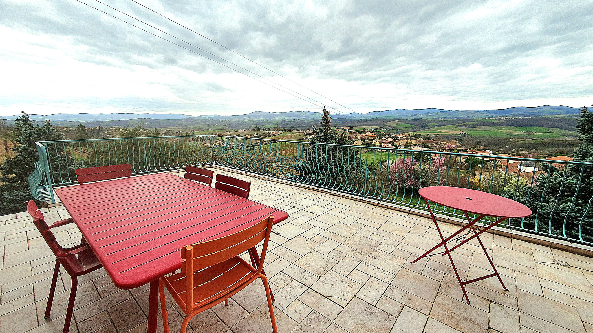 Maison de caractère avec une vue exceptionnelle au coeur des vignes du Beaujolais et des pierres dorées, venez découvrir cette demeure composée d'une spacieuse entrée avec rangements, ouverte sur un séjour / salle à manger de 83 m2, une cuisine équipée donnant sur une terrasse de 45 m2 avec une vue à couper le souffle sans vis-à-vis. Elle possède 5 chambres dont certaines avec une salle d'eau et des dressings, une buanderie, un bureau, un atelier d'artiste de 80 m2 pouvant être modifié en plusieurs pièces.